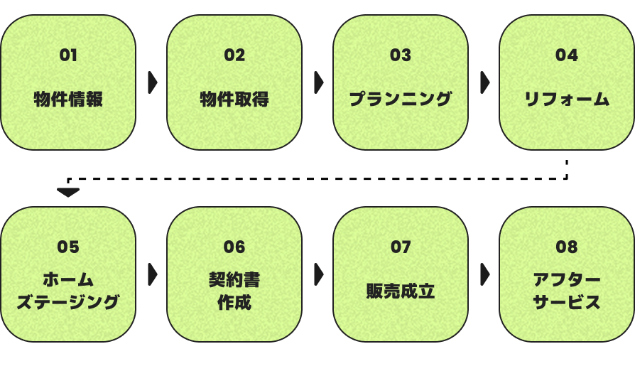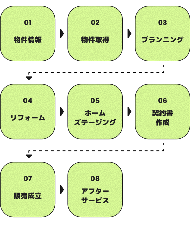 当社では、物件の取得から、プランニング・図面の作成、内装工事の施工、アフターサービスに至るまで、自社で内製化し一貫して行います。社内のスムーズな連携により施工精度を高めるだけでなく、スピーディーな商品化を可能にし、外部コストを抑えることにより省コスト化の実現にも貢献しています。
