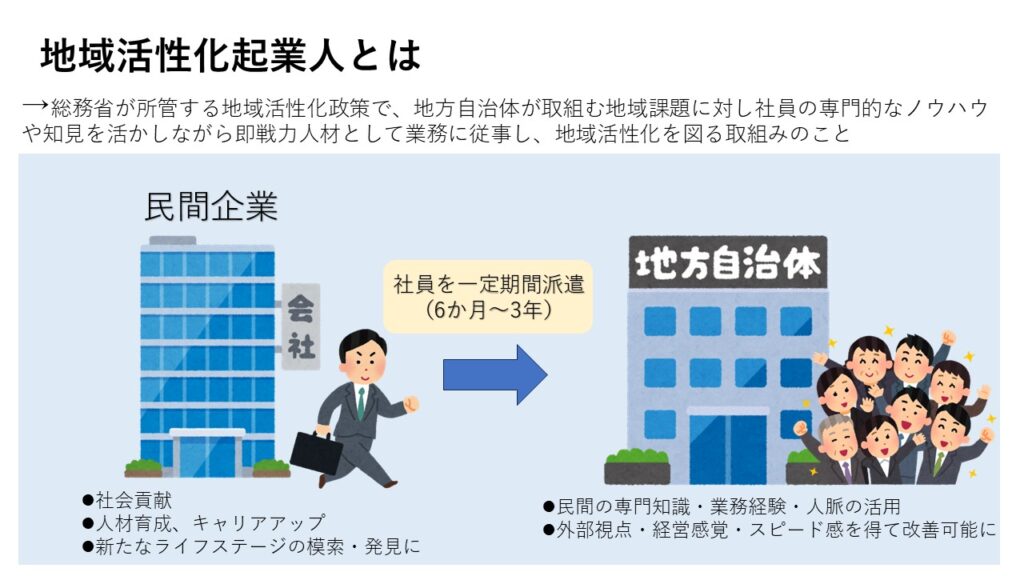 総務省が推進する「地域活性化起業人制度」は、地域力の創造と地方の再生を目的として2014年度に導入された制度です。「地域活性化起業人制度」においては、三大都市圏に所在する企業などが、地方公共団体へ社員を一定期間派遣し、そのノウハウや知見を生かしながら、地域独自の魅力や価値の向上などにつながる業務に従事することで、地域活性化を図ることを目的としています。