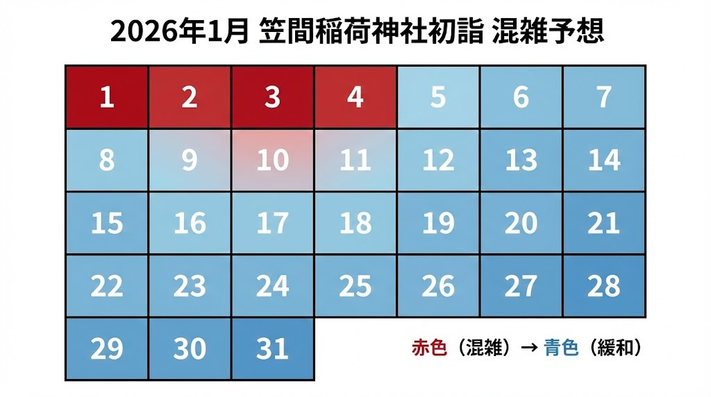 1月1日~4日は混雑し、特に10:00~14:00が初詣のピークとなるようです。混雑を避けたい方は笠間稲荷神社に9時前か14時以降、日程では5日以降がおススメです。