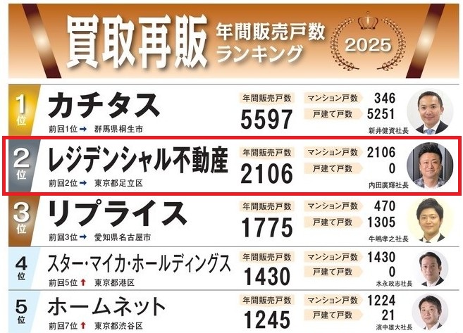 当社は、2025年7月28日発行のリフォーム産業新聞で発表された「買取再販年間販売戸数ランキング2025」(注)において、