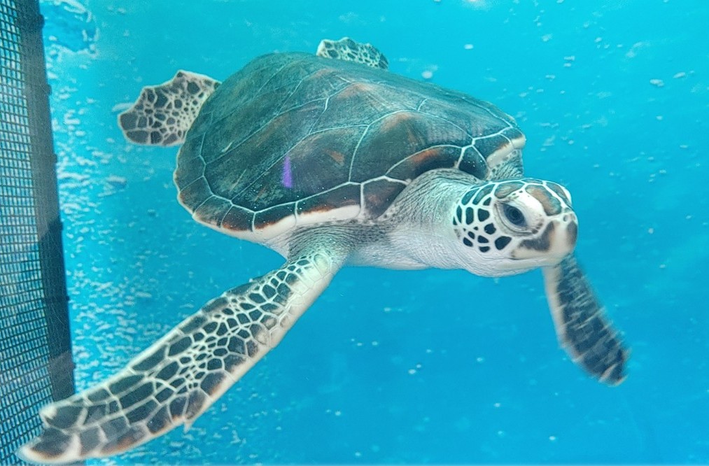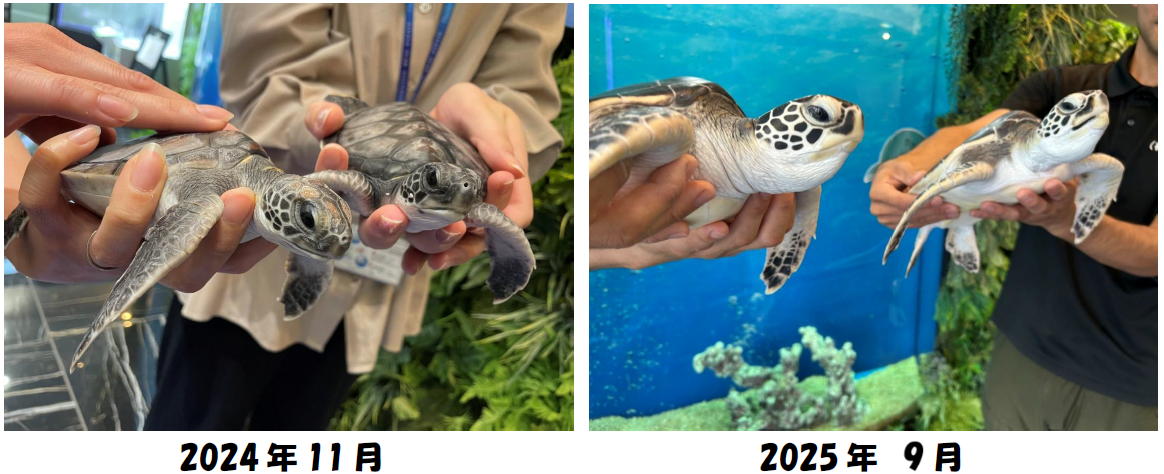 これは、エルナが主催する「ウミガメ ジョイントブリーディング」に参加したもので、手のひらサイズだった子ガメたちは、今では力強く泳ぐ立派な姿へと成長しました。