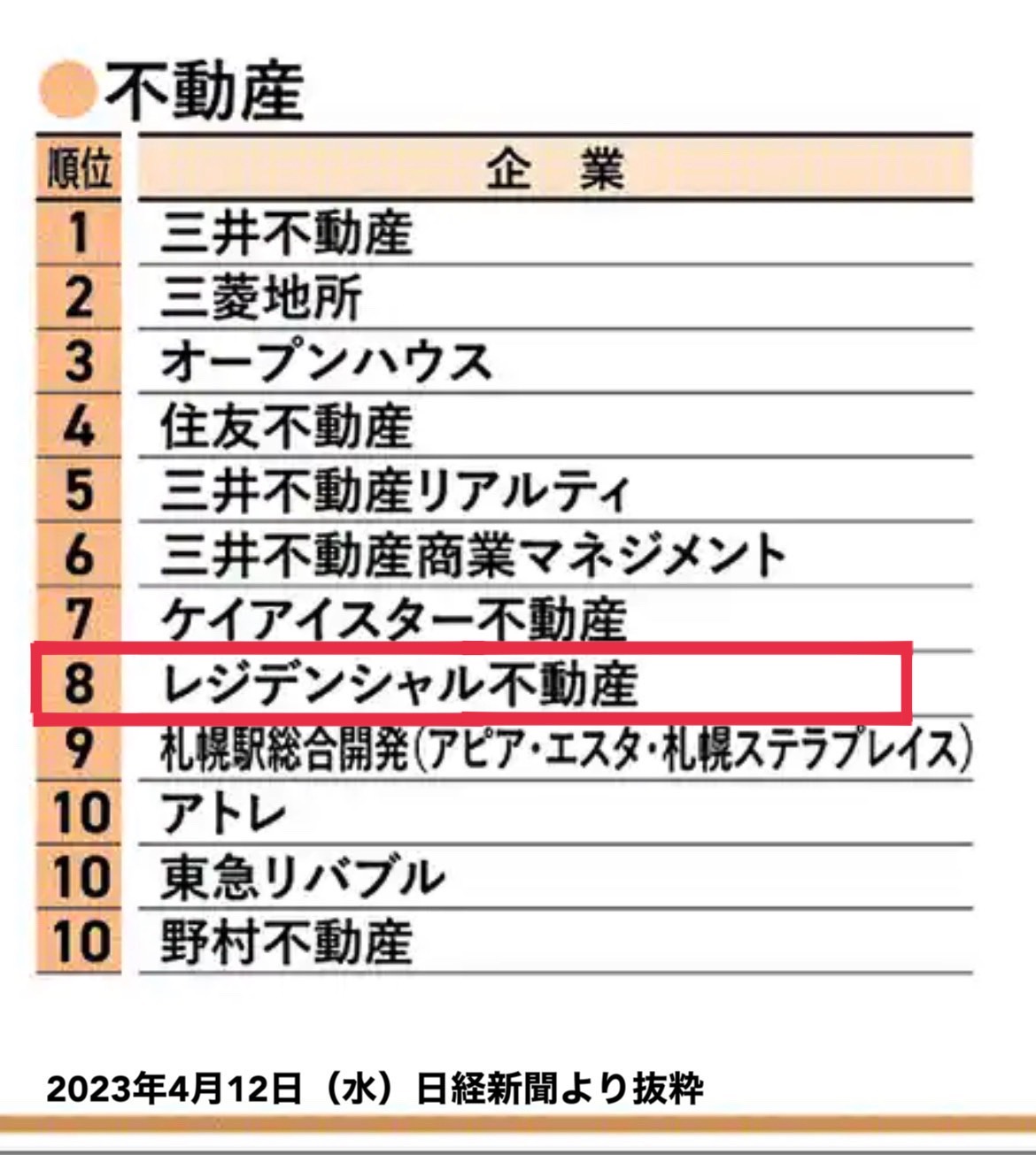 「業種別人気企業ランキング」(注)不動産業界部門の中で、当社レジデンシャル不動産が